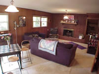 The big, bright 23x14 ft family room has a fireplace and built-in shelves.