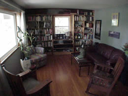 Two decks overlook the large backyard gardens. Built-in book shelves line one end of the 14x12 ft gallery-like living room.