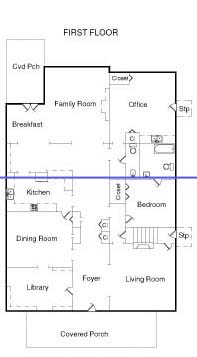 The blue line shows the original house that had a central staircase.