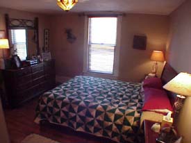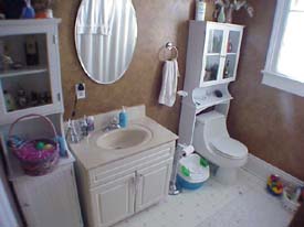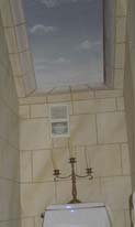 The powder room trompe l’oeil (left) offers a sky view from a window in a stone chateau.