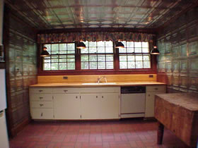 The city-style kitchen is unique with tin ceiling and walls, skylight and antique butcher block.