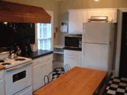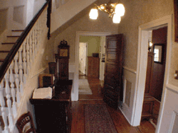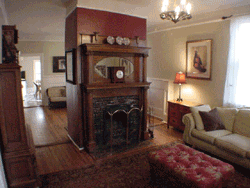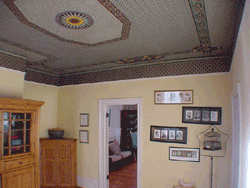 There is a story that goes with the handsome ceiling wall paper, please ask. Now used as a family room, the downstairs master bedroom has its own entrance to the wrap around front porch. There have been lots of updates. The modern eat-in kitchen leads out to the back deck throught a bright utility room. The dual zoned heating system is new, and all four fireplaces are working. |