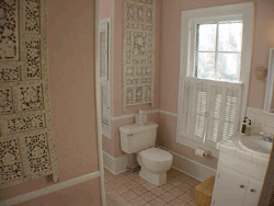 The upstairs bathroom is as bright and interesting as the rest of the house.