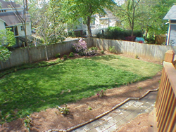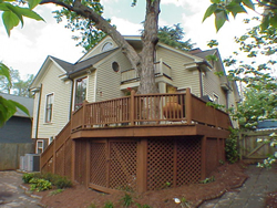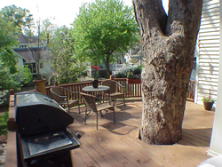 A large deck and a master bedroom balcony overlook the fenced backyard with lots of room for gardening. This tree has been lovingly maintained and is the centerpiece of the large deck. |