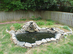 The deck overlooks the large fenced yard, complete with koi pond.