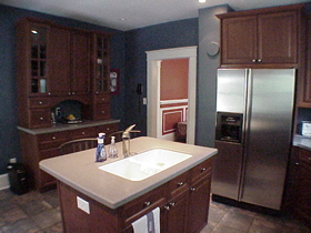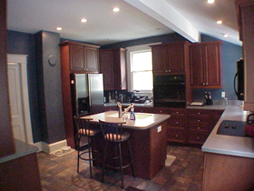 The classic old blends nicely with the modern gourmet kitchen with a tile floor, solid surface countertops, custom cabinetry, glass-top electric range, and kitchen island.