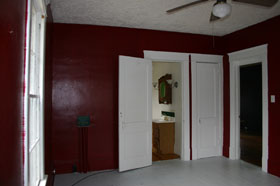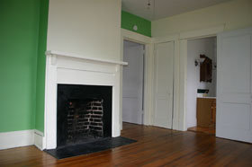 One of the two bedrooms features a fireplace. The two bedrooms share a full bathroom with lots of natural light.