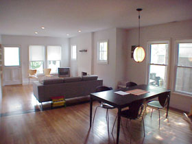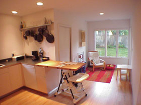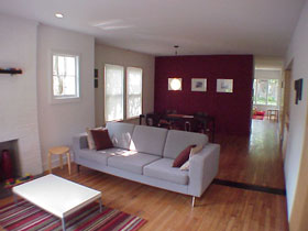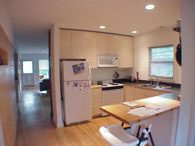 In the kitchen, floor to ceiling cabinets provide a recessed "pantry wall" and a cantilevered butcher block counter separates the new kitchen from the sun/breakfast room that opens onto the back deck just steps away from the concrete driveway.