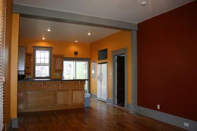 The newly renovated kitchen is wide open to the living space. The refrigerator is tucked away in a built-in wall space creating a fun space in which to cook.