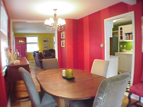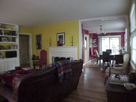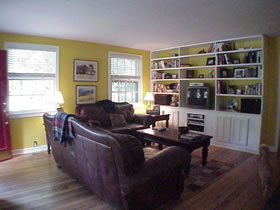 The big 16x14ft Living Room has a wall of handsome new bookshelves.