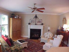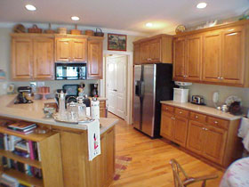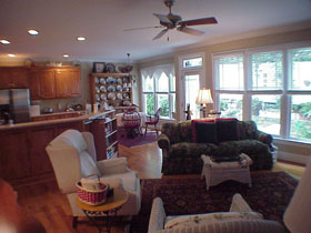 A wall of windows is shared by the open, flowing kitchen, breakfast and family room area that overlooks the back yard and patio. The versatile family room has lots of options for placing an entertainment center and/or bookshelves. Top left photo is the view from the kitchen. Adler cabinets, Corian counters with a one piece sink and a large pantry closet - this is not your Grandmother's kitchen.