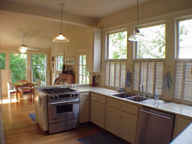 The handsome dining room also has a distinctive mantel. The bright updated kitchen opens through a sun/breakfast room to a deck overlooking the fenced back yard.