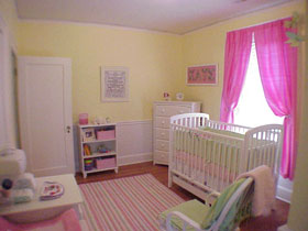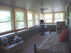 The old-fashioned sleeping porch is a versatile space. It presently includes a clothes washer and dryer that were moved upstairs from a space now used as an office. |