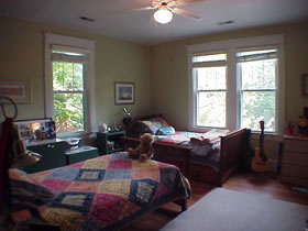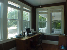 The bright sunroom at the front of the house faces south. It would be a great home office.