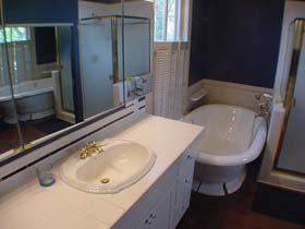 The master bath is magnificent with a separateub and shower and mirrors on two facing walls. Sliding mirror-doors lead to an additional master closet. This is a real master bedroom suite! |