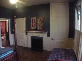 The master bedroom has wooden shutters. 2 closets and the decorative fireplace shown here. The other 2 bedrooms and 1 bath are part of a two-story addition at the end of the house. |