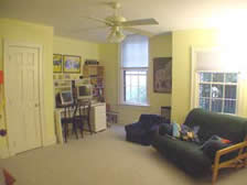 The front parlor/ family room is across the hall from the living room, both 15 x 15 ft. Renovations have included raised ceilings and new plaster walls in several rooms.