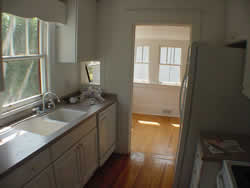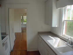 Looking toward the front of the home, you see the new kitchen with a double sink and oversized oven/ range.